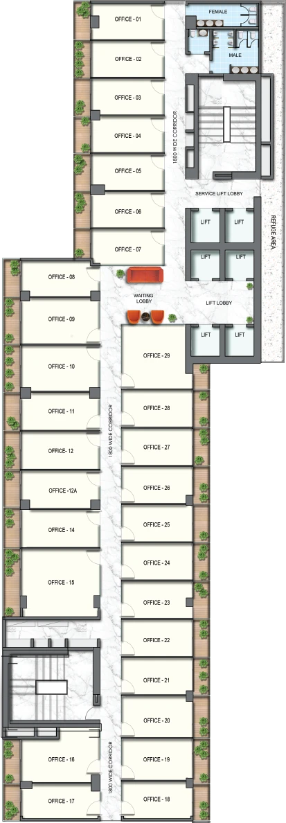 - Every office gets natural light and ventilation from balcony offering panoramic view.